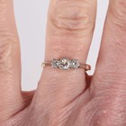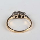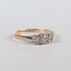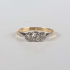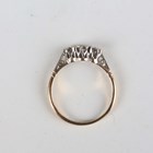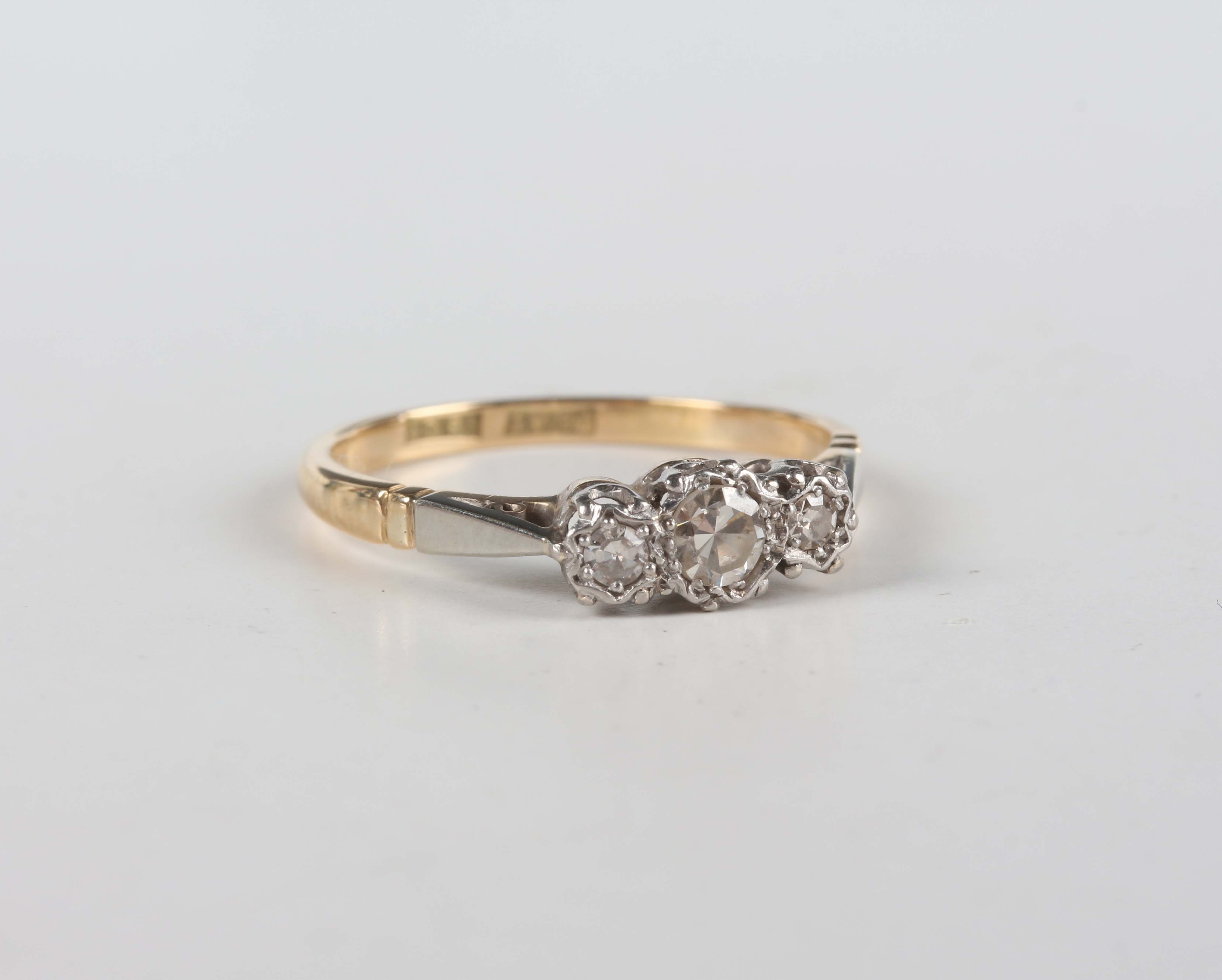 A gold, platinum and diamond three stone ring, mounted with a row of single cut diamonds, detailed ‘18ct Plat’, weight 1.9g, ring size approx L.