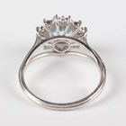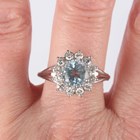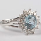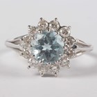 A white gold, aquamarine and diamond cluster ring, claw set with a circular cut aquamarine within a surround of circular diamonds, unmarked, weight 6g, ring size approx V.