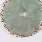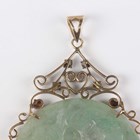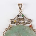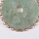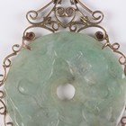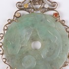 A gold mounted jade pendant, the circular jade bi disc carved in low relief with animal motifs, within a scroll pierced surround with a varicoloured jade set surmount, indistinctly detailed ‘14K 585’, weight 27g, length 8.5cm, diameter of disc 5cm.