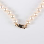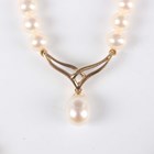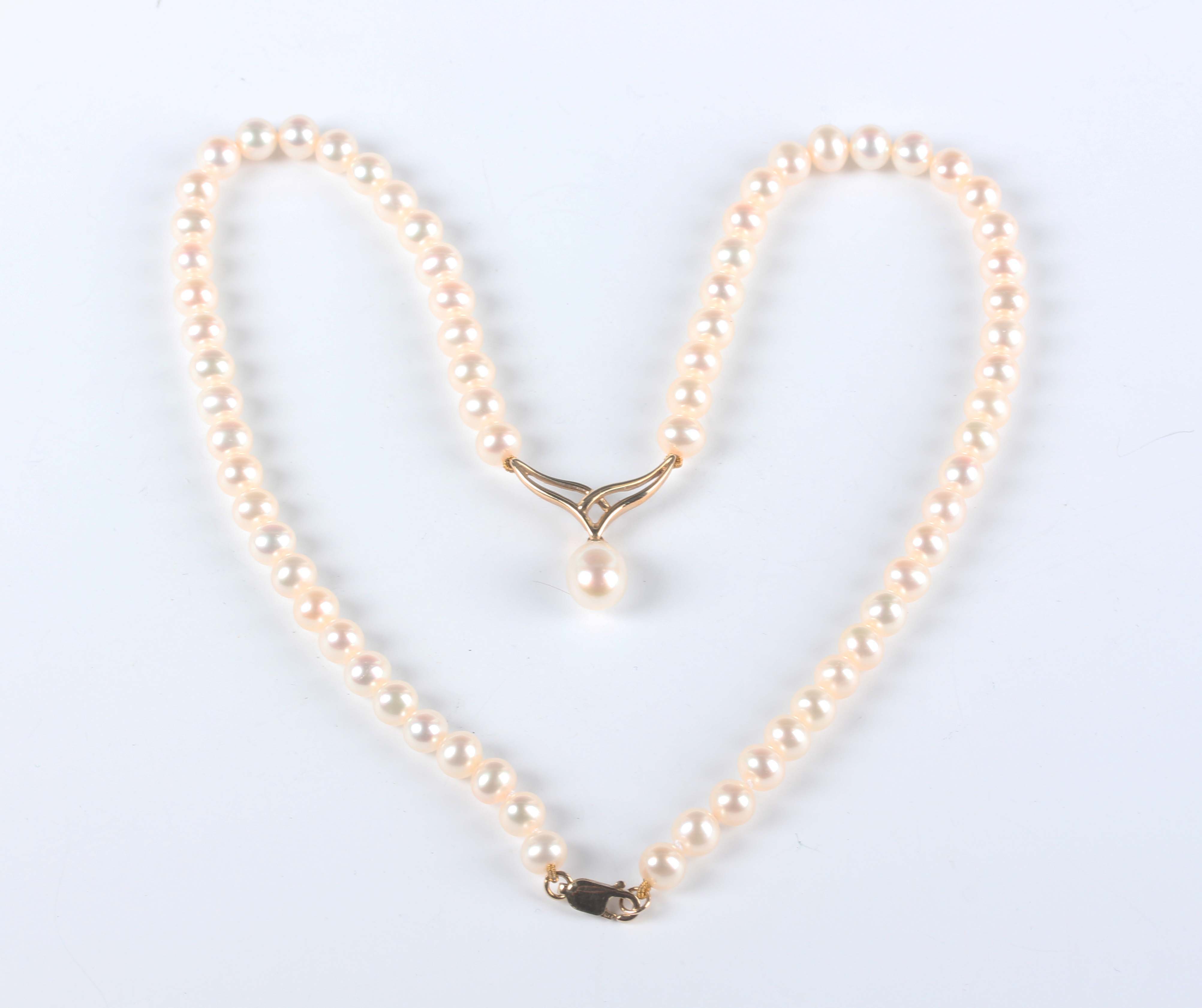 A single row necklace of cultured pearls, the front with a 9ct gold and cultured pearl drop, on a gold sprung hook shaped clasp, detailed ‘375’, length 41.5cm.