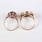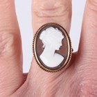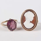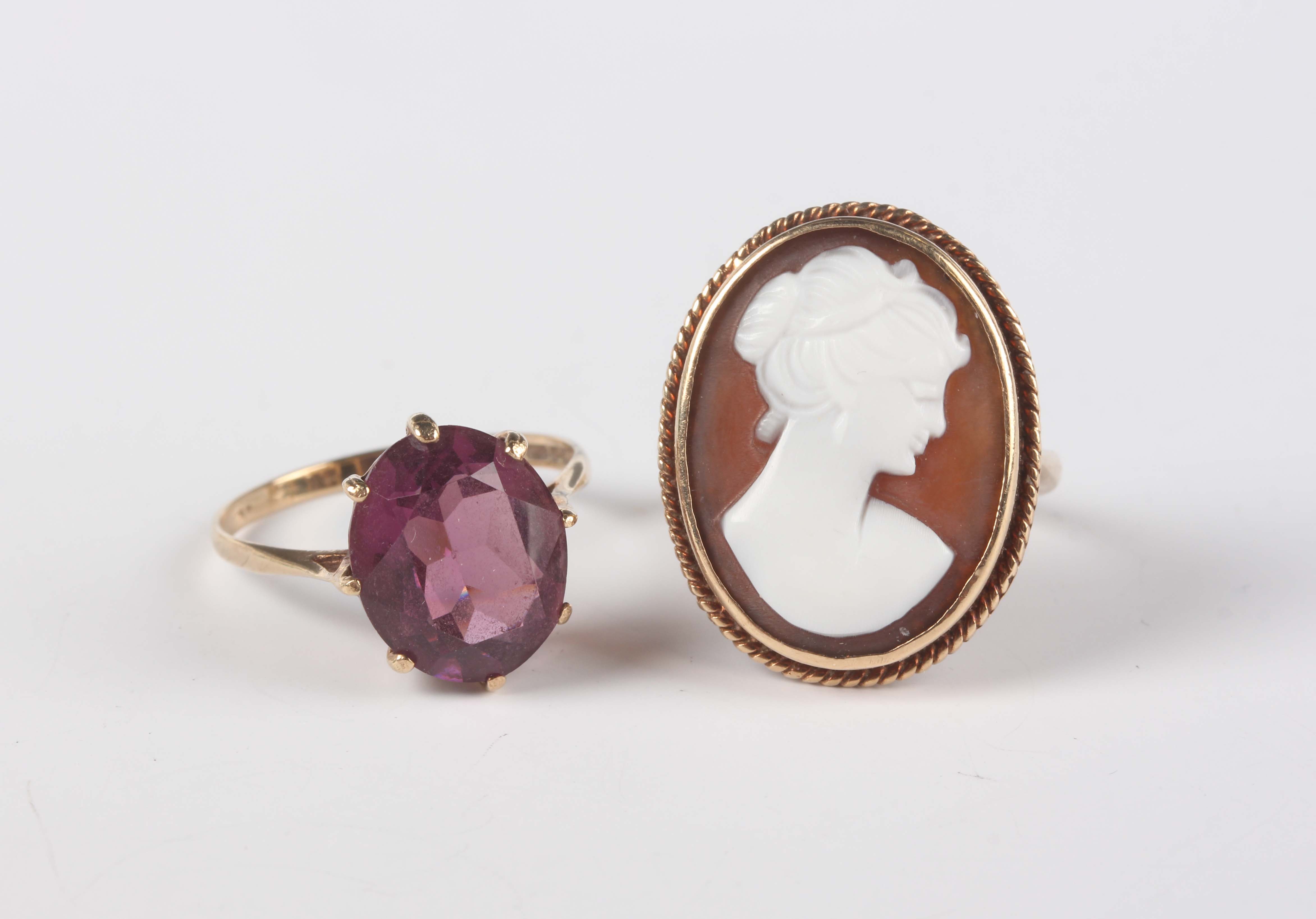 A 9ct gold mounted, oval shell cameo ring, carved as a portrait of a lady within a ropetwist wirework surround, Birmingham 1966, ring size approx M1/2, and a 9ct gold and synthetic mauve gem set solitaire ring, Birmingham 1978, ring size approx N, total weight 6.3g.