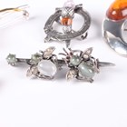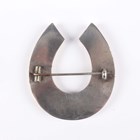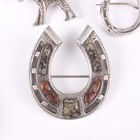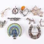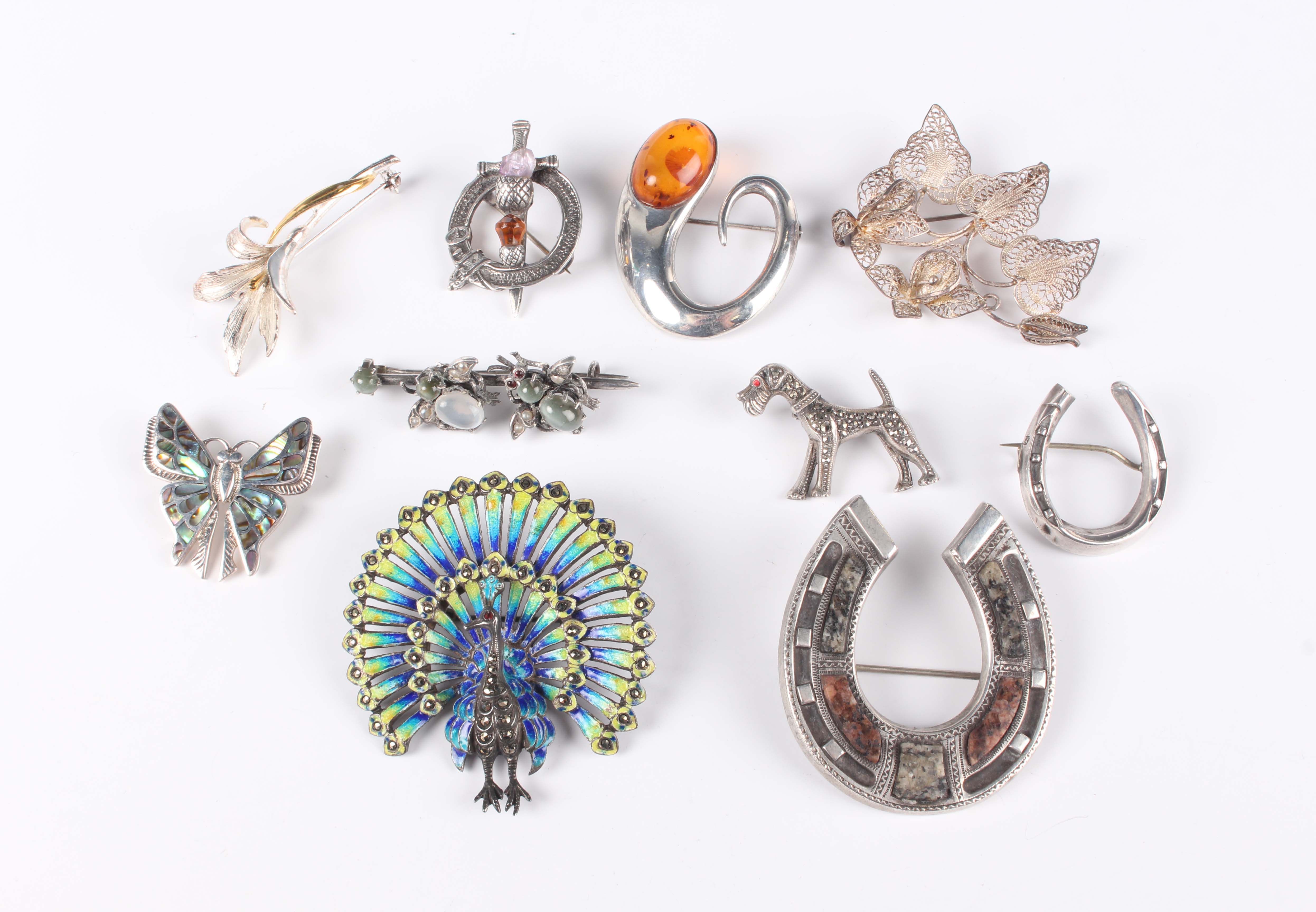 A silver, enamelled and marcasite brooch, designed as a peacock in display, detailed ‘Sterling’, width 5cm, a Victorian varicoloured granite set brooch, designed as a horseshoe, a silver and marcasite brooch, designed as a dog, and seven further mostly silver brooches in a variety of designs.