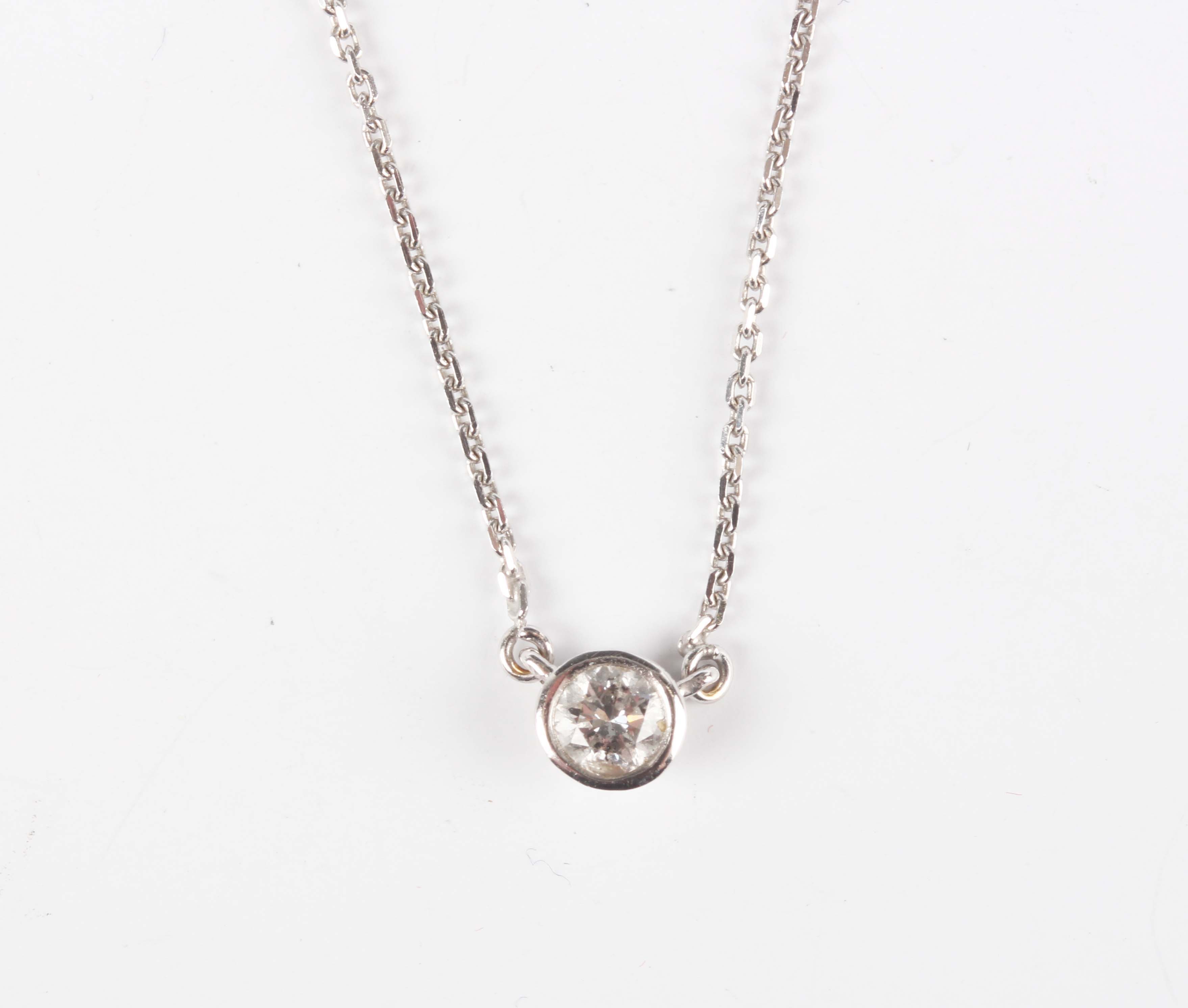An 18ct white gold and diamond single stone pendant necklace, collet set with a circular cut diamond, on a boltring clasp, detailed ‘750’, weight 2.5g, length 42.5cm.