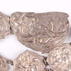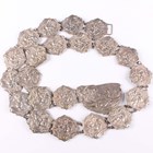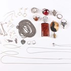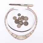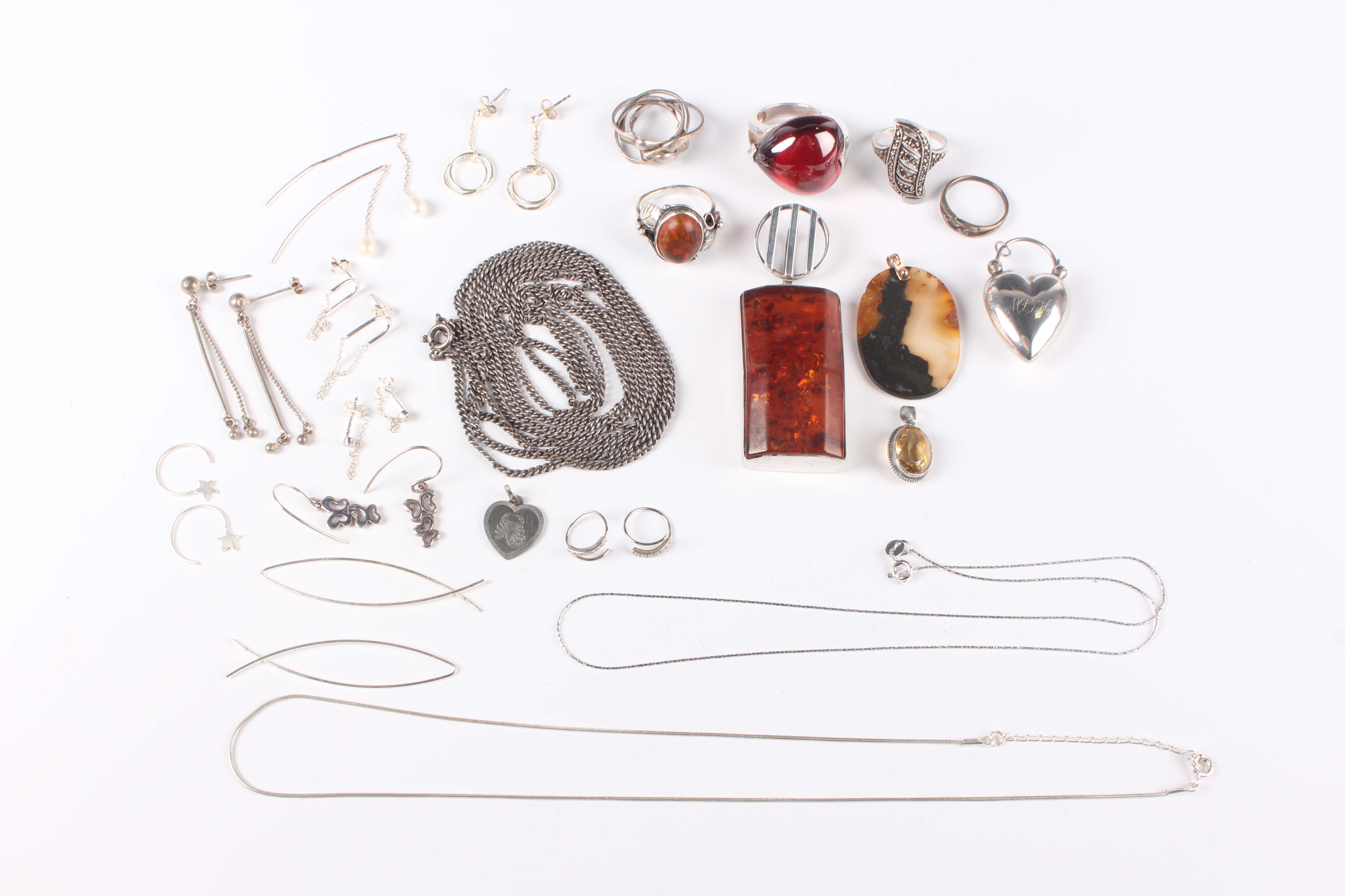 A group of mostly silver mounted jewellery, including five rings, a reconstituted amber pendant, a neckchain, a citrine single stone pendant, an oval agate pendant, a heart shaped padlock clasp, glazed with a hair locket, a collar necklace, detailed ‘925’, a necklace of graduated geometric design, detailed ‘925’, and a few further items, together with a silver bladed mother-of-pearl folding fruit knife, Birmingham 1890, a plated waistbelt and eleven mostly silver coins.