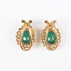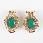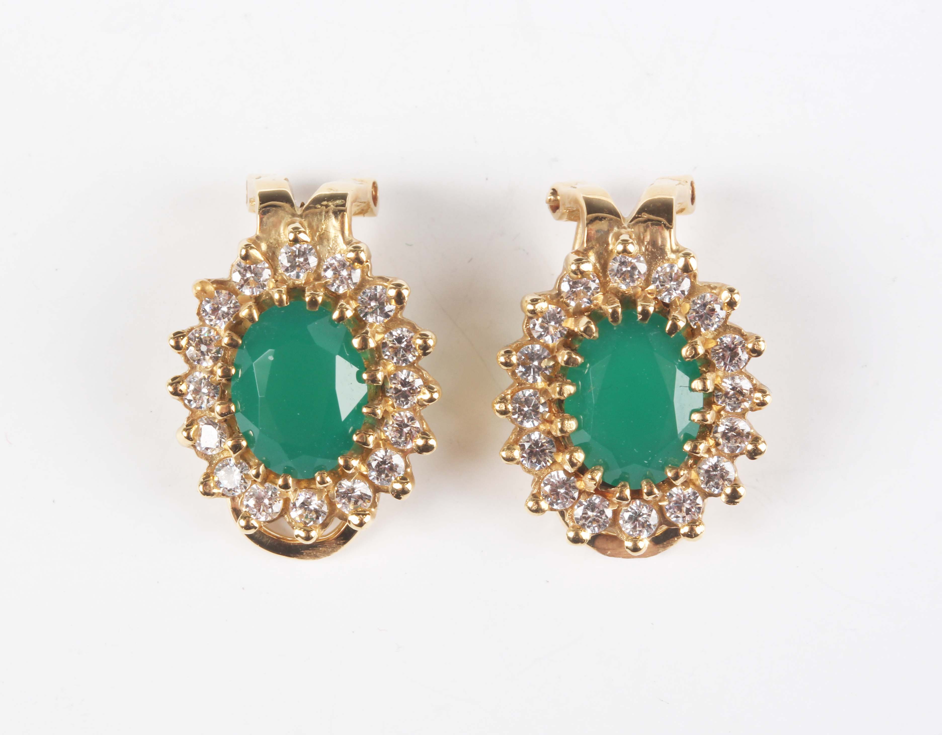 A pair of gold, emerald and colourless gem set oval cluster earclips with folding fittings, detailed '18K', weight 5.3g, length 1.7cm.