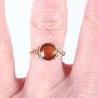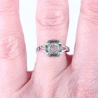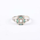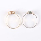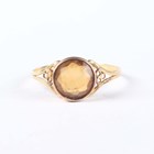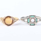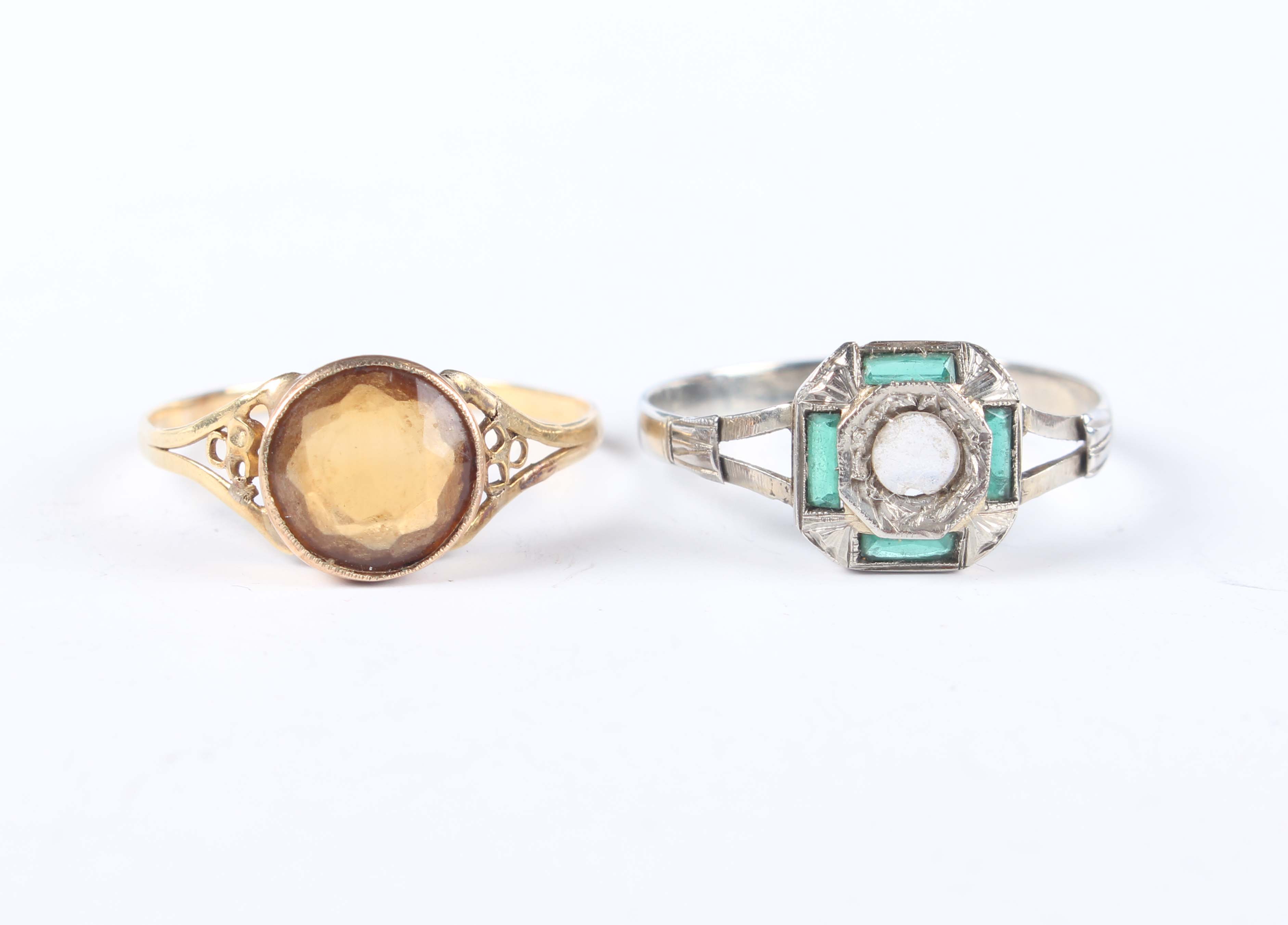A gold ring, collet set with a circular cut citrine between pierced shoulders, unmarked, weight 1.3g, ring size approx P, and a white gold, green and colourless gem set ring of Art Deco design, detailed ‘750’, weight 1.6g, ring size approx P.