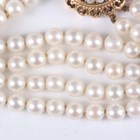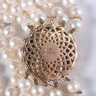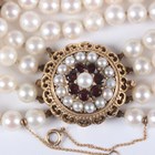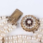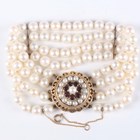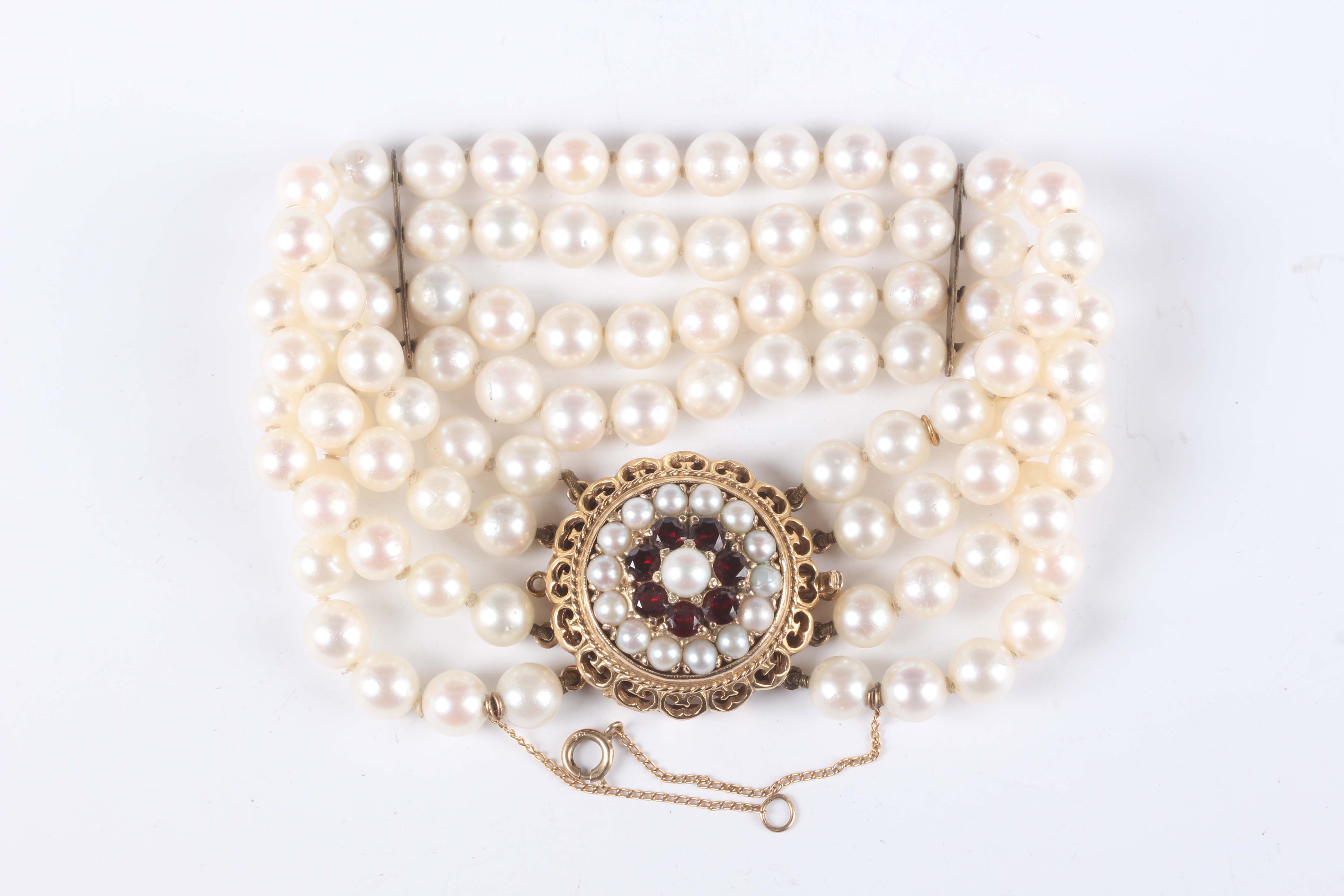A four row bracelet of uniform cultured pearls on a 9ct gold, garnet and cultured pearl circular clasp, total weight 47g, length 19cm, diameter of clasp 2.5cm.