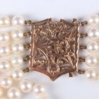 A five row necklace of uniform cultured pearls, on a gold clasp with scroll pierced decoration, detailed ‘585’, total weight 106.8g, length of shortest strand 34cm, length of longest strand 43.5cm.