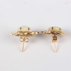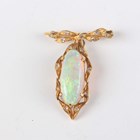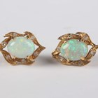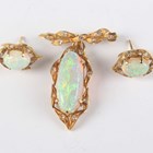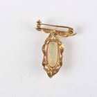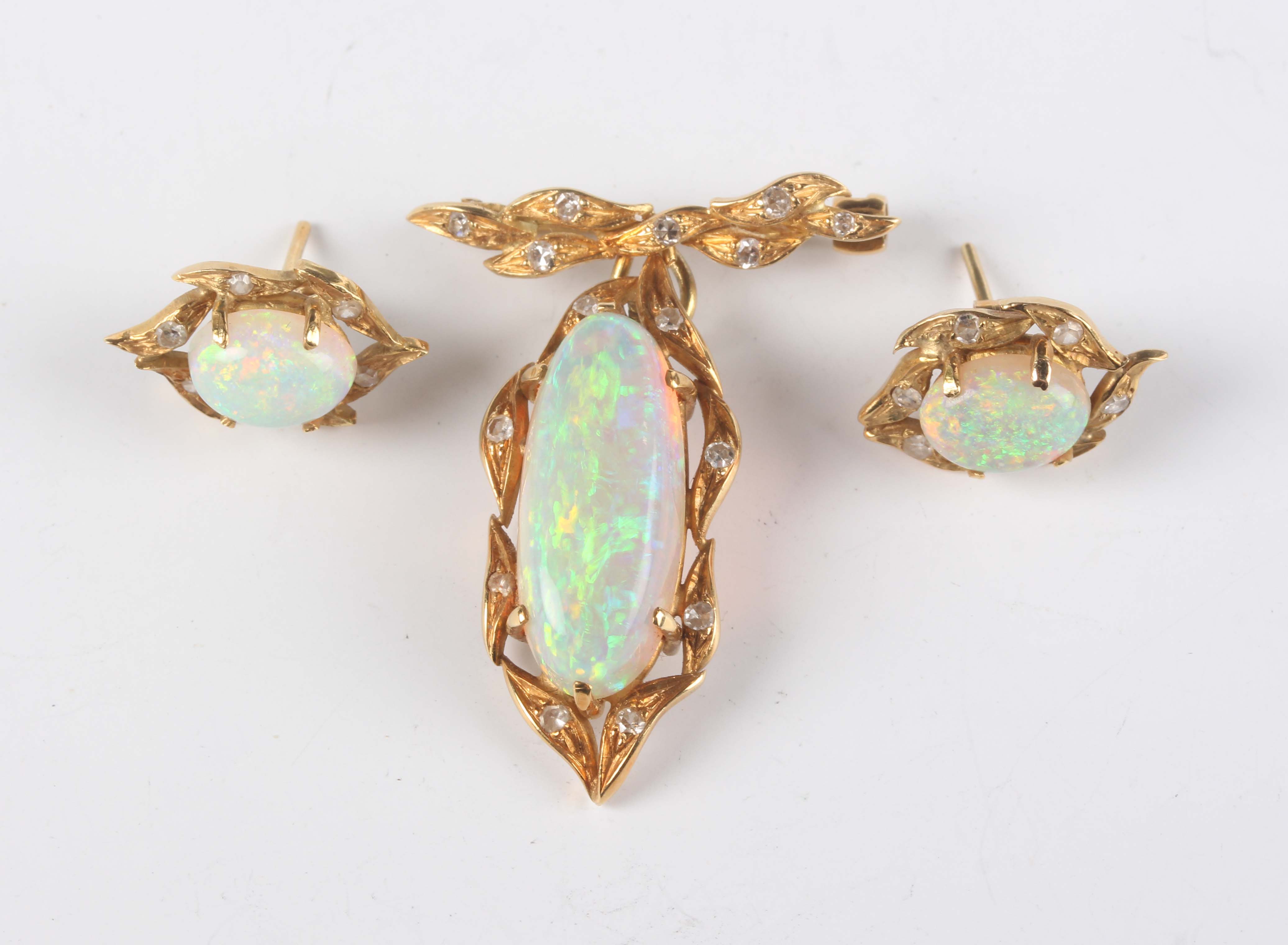An 18ct gold, opal and diamond pendant, claw set with the oval opal within a diamond set foliate surround, with a detachable 18ct gold and diamond set brooch fitting, total length 3.5cm, together with a pair of 18ct gold, opal and diamond earstuds, each claw set with an oval opal within a diamond set foliate surround, with differing butterfly fittings, both detailed ‘750’, total weight 10.4g.