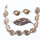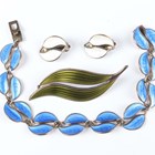 A group of Norwegian silver and enamelled jewellery, comprising a blue enamelled bracelet by David Andersen, the links of twin foliate form, detailed ‘D-A 925 S Sterling Norway’, length 17.5cm, a pair of white enamelled earclips by David Andersen, each of twin foliate form, detailed ‘D-A 925 S Sterling Norway’, and a green enamelled brooch by Aksel Holmsen, of twin foliate form, detailed ‘Sterling Norway 925 S’