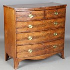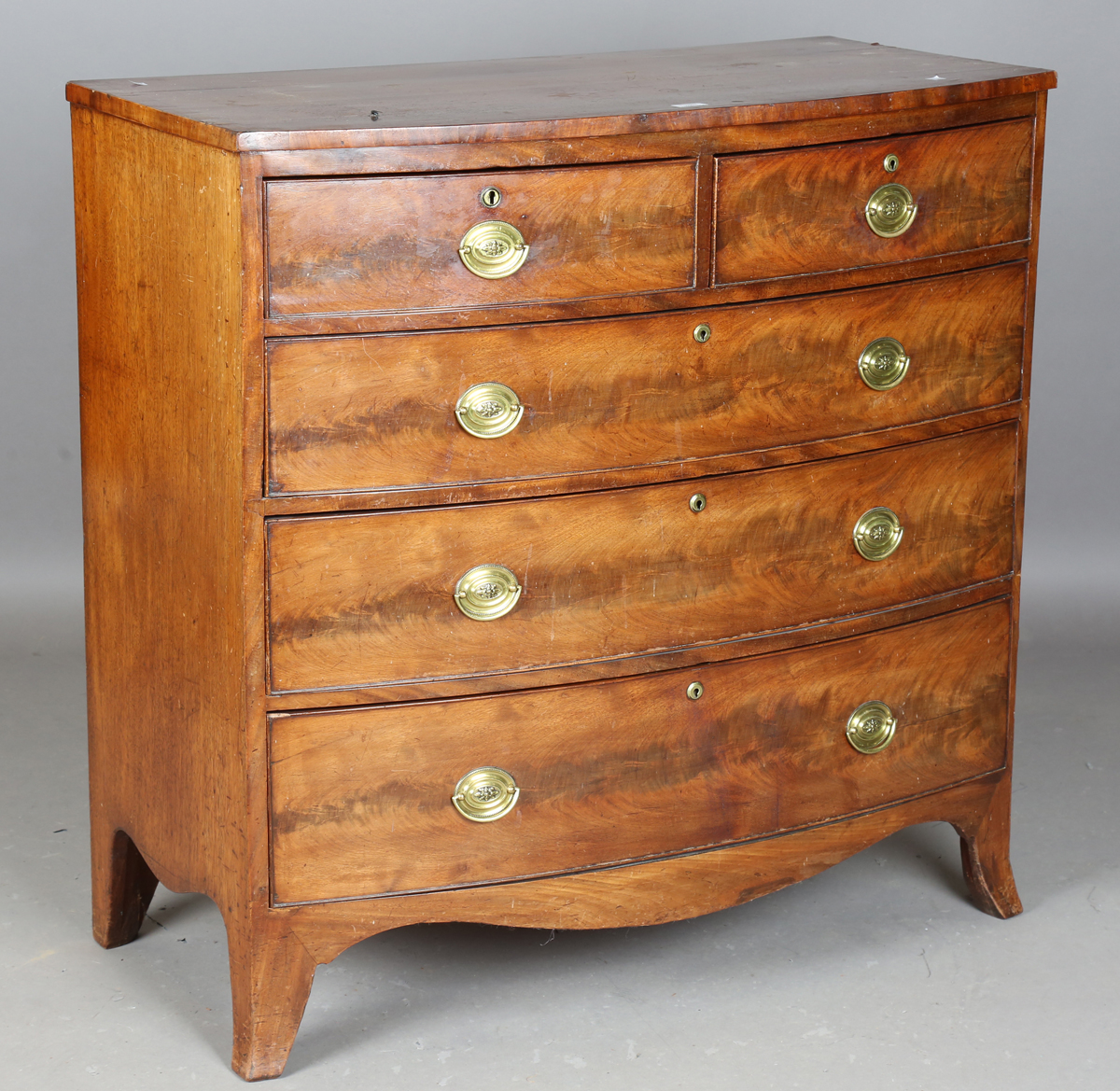 A late George III mahogany bowfront chest of two short and three long drawers, on splayed bracket feet, height 107cm, width 107cm, depth 55cm.