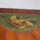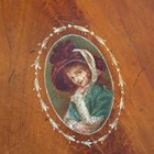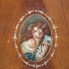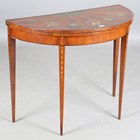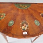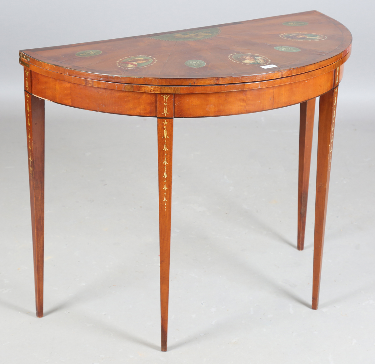 An early 20th century George III style walnut demi-lune fold-over card table, the top painted with three oval portrait reserves, height 74cm, width 92cm, depth 46cm.