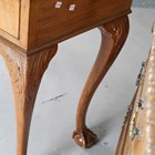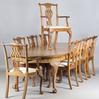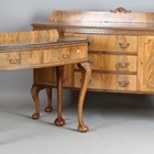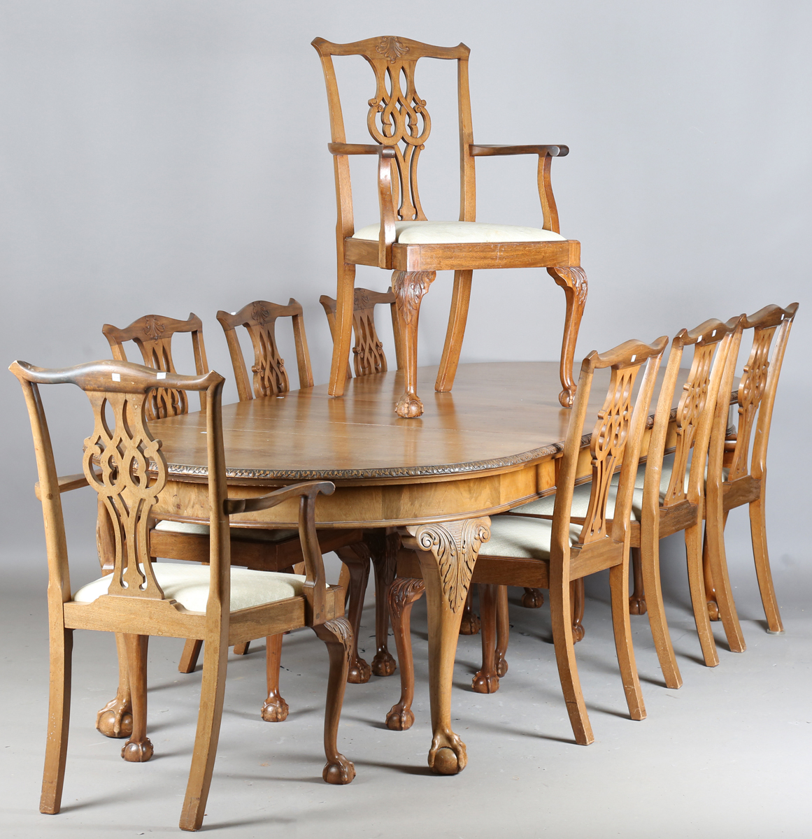 An early 20th century Queen Anne style walnut dining room suite, comprising an extending dining table, height 75cm, extended length 288cm, depth 115cm, a set of eight chairs, a sideboard and a serving table.