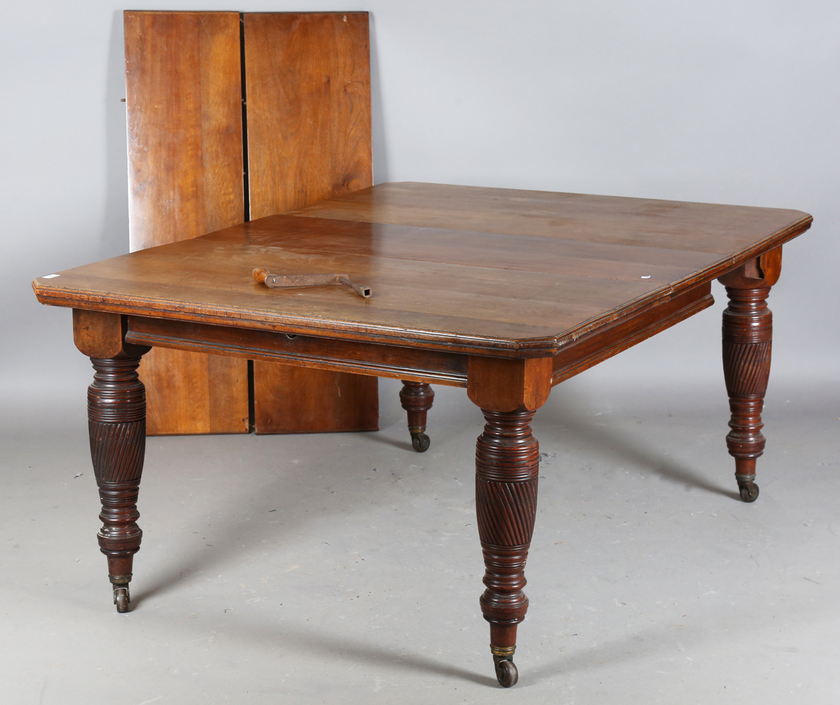 An Edwardian walnut extending dining table, the top with three extra leaves, on spiral reeded legs and castors, height 74cm, extended length 236cm, unextended length 130cm, depth 121cm.