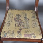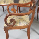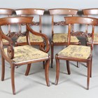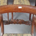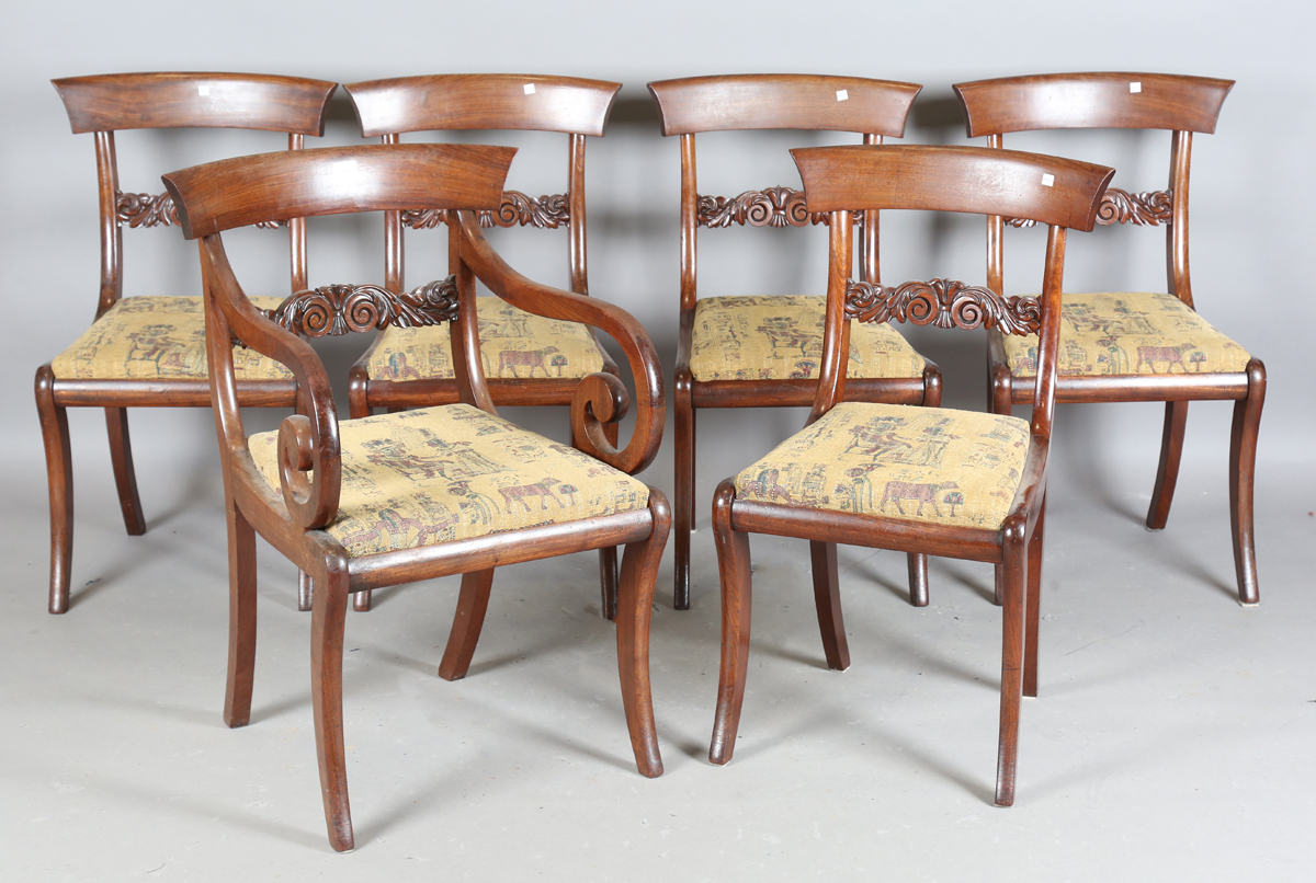 A set of six Regency mahogany bar back dining chairs with carved foliate centre rails, comprising a single carver, height 88cm, width 59cm, and five standards, height 87cm, width 47cm.