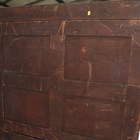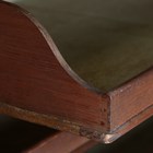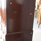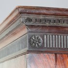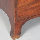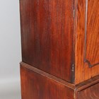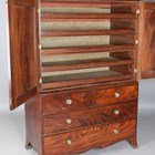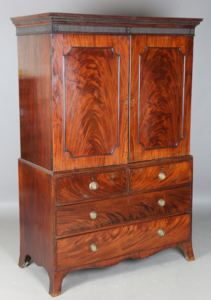 A George III mahogany linen press, the dentil pediment with a fluted frieze and carved rosettes above two panelled doors enclosing sliding trays, above an arrangement of oak-lined drawers, height 188.5cm, width 126cm, depth 63cm.
