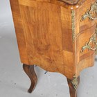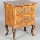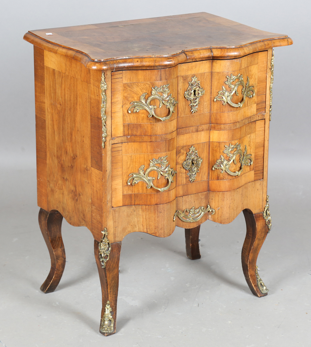 A late 19th/early 20th century Louis XV style walnut and gilt metal mounted serpentine fronted chest of two drawers, bearing stencilled mark to reverse, height 78cm, width 64cm, depth 47cm.