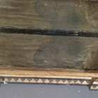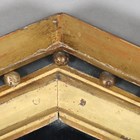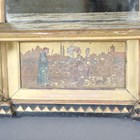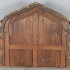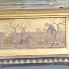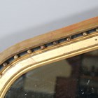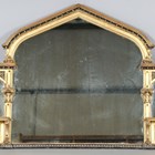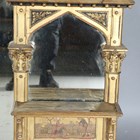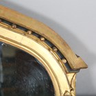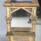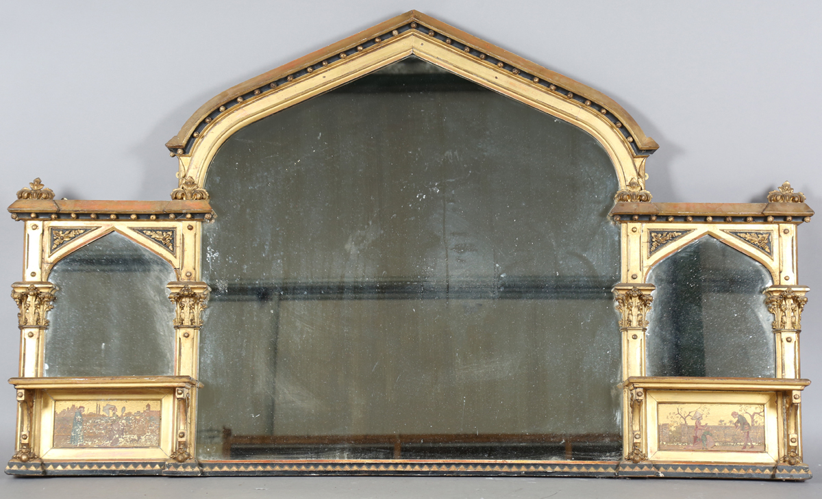A mid-Victorian Gothic Revival giltwood and gesso overmantel mirror, in the manner of Charles Bevan, the arched ballshot pediment above chamfered pilasters and two painted figural panels, height 118cm, width 198cm.