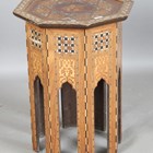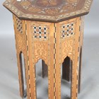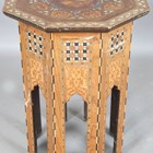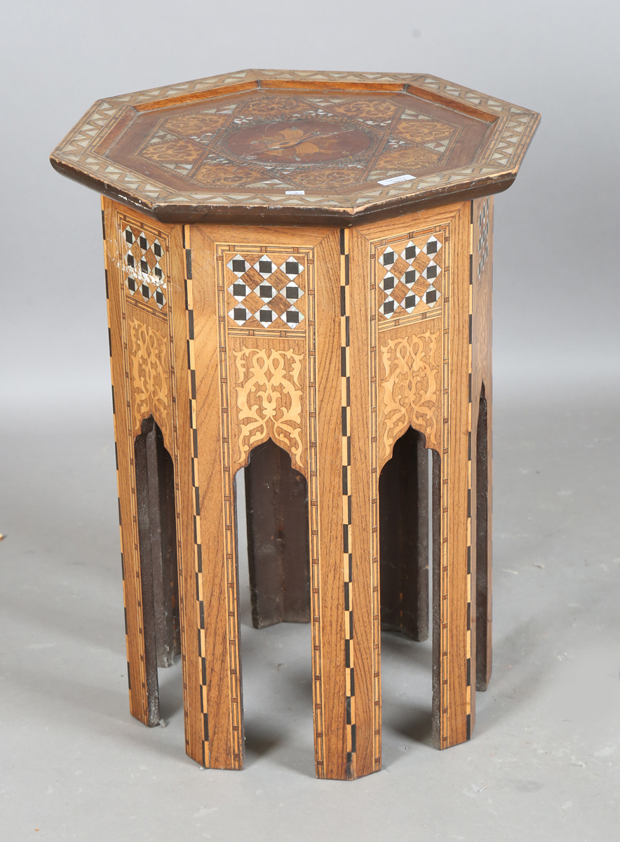A late 19th century Middle Eastern octagonal occasional table, profusely inlaid with geometric panels and foliate scrolls, height 63cm, width 47cm.