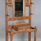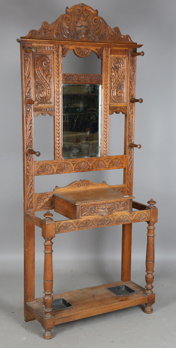 A late Victorian oak hallstand, profusely carved with scrolls and lions' heads, height 221cm, width 96cm, depth 36cm.