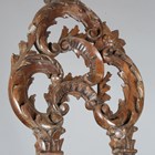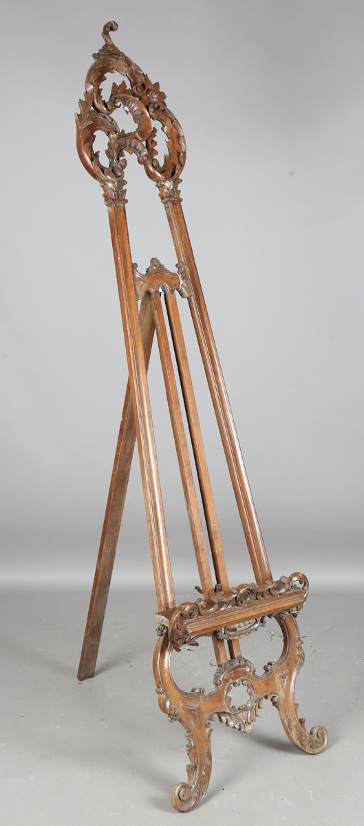 A 20th century rococo style hardwood easel with carved foliate frame, height 224cm, width 61cm.