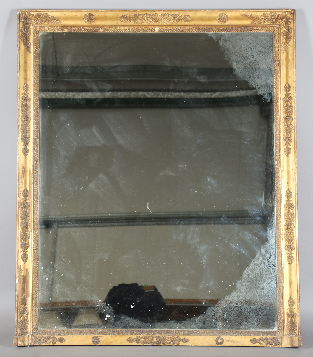 A 19th century giltwood and composition rectangular overmantel mirror, the cushion moulded frieze with applied palmette and scroll mouldings, 148cm x 123cm.