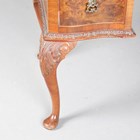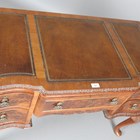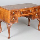 A 20th century Queen Anne style walnut writing desk, the top inset with gilt tooled brown leather above five drawers, on cabriole legs, height 78cm, width 107cm, depth 56cm.