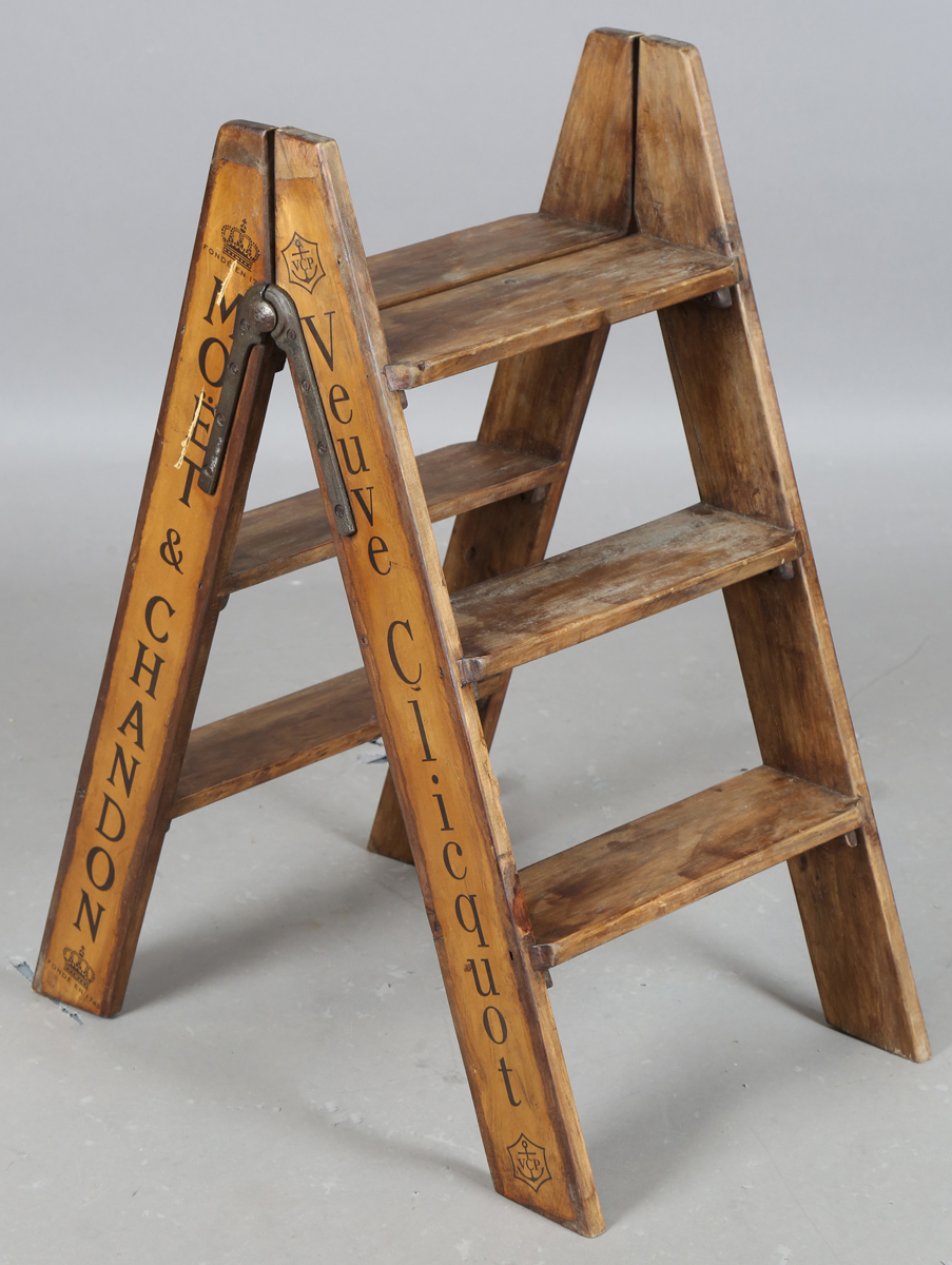 A set of modern walnut folding steps, signwritten to both sides with champagne advertising, height 81cm, width 68cm, depth 43cm.
