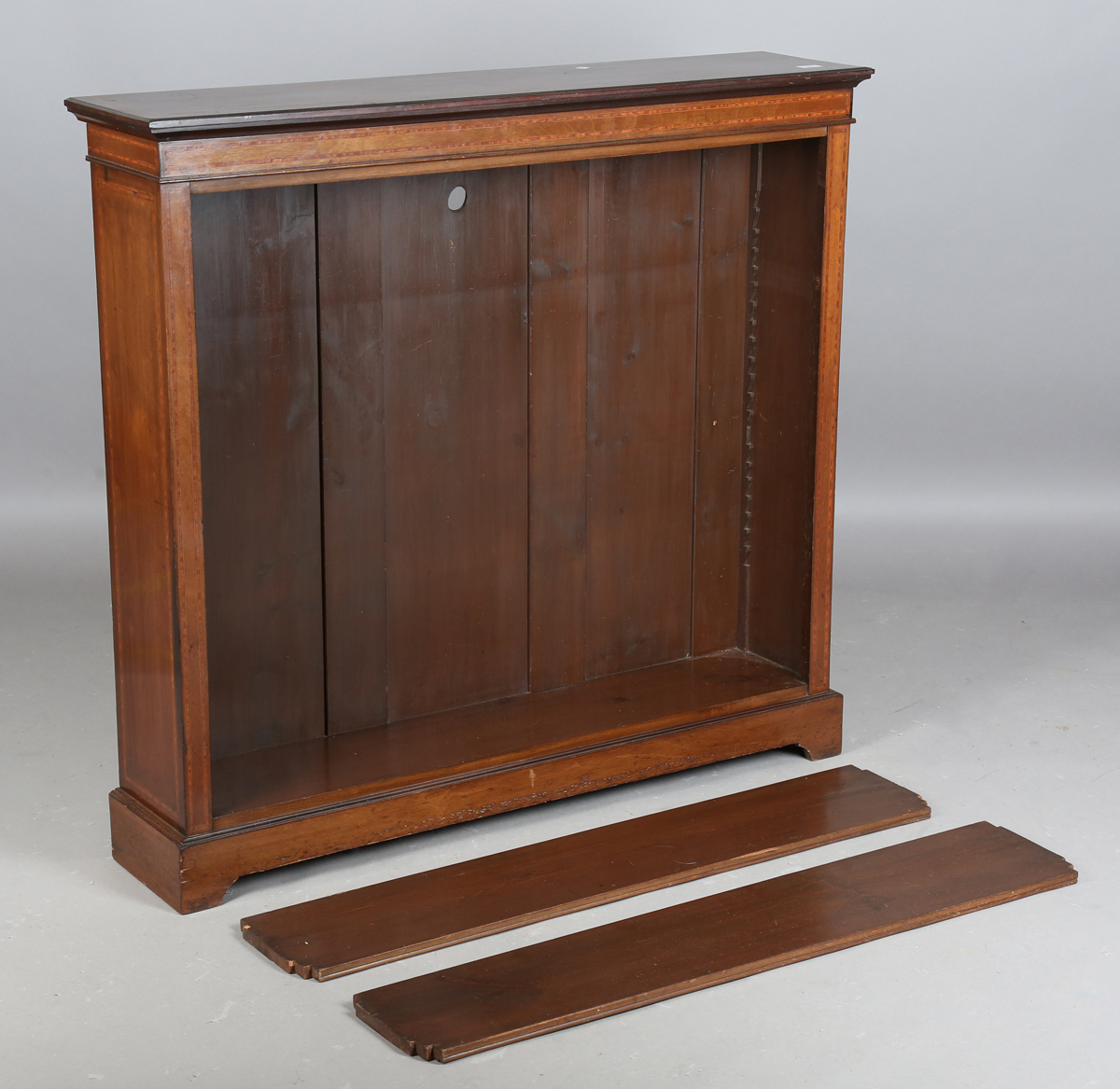 An Edwardian mahogany and satinwood crossbanded open bookcase, height 114cm, width 122cm, depth 28cm.