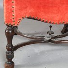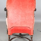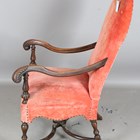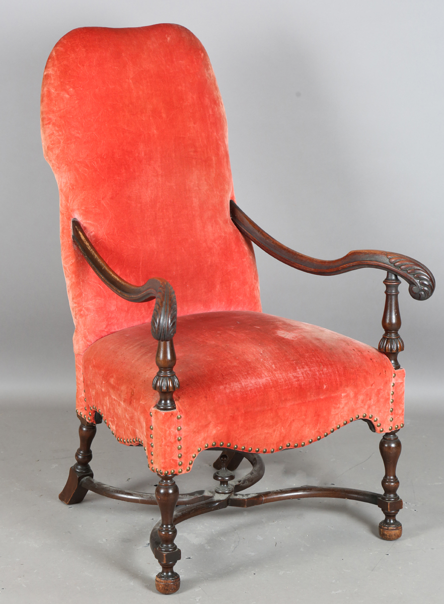 A late 19th/early 20th century Carolean Revival mahogany framed elbow chair, upholstered in pink velour, height 117cm, width 76cm, depth 78cm.