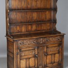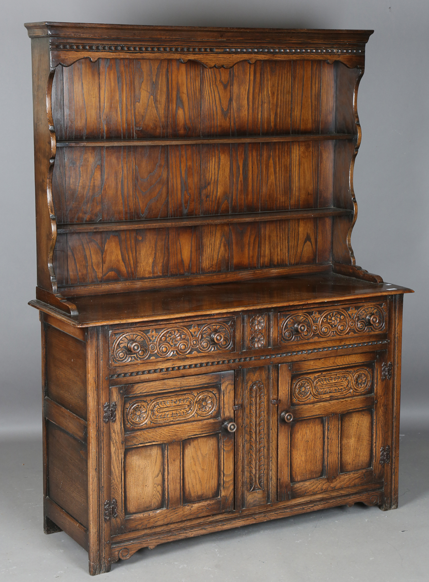 A 20th century Carolean Revival oak dresser with carved decoration, height 182cm, width 134cm, depth 46cm.