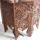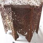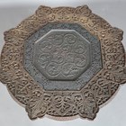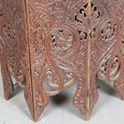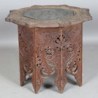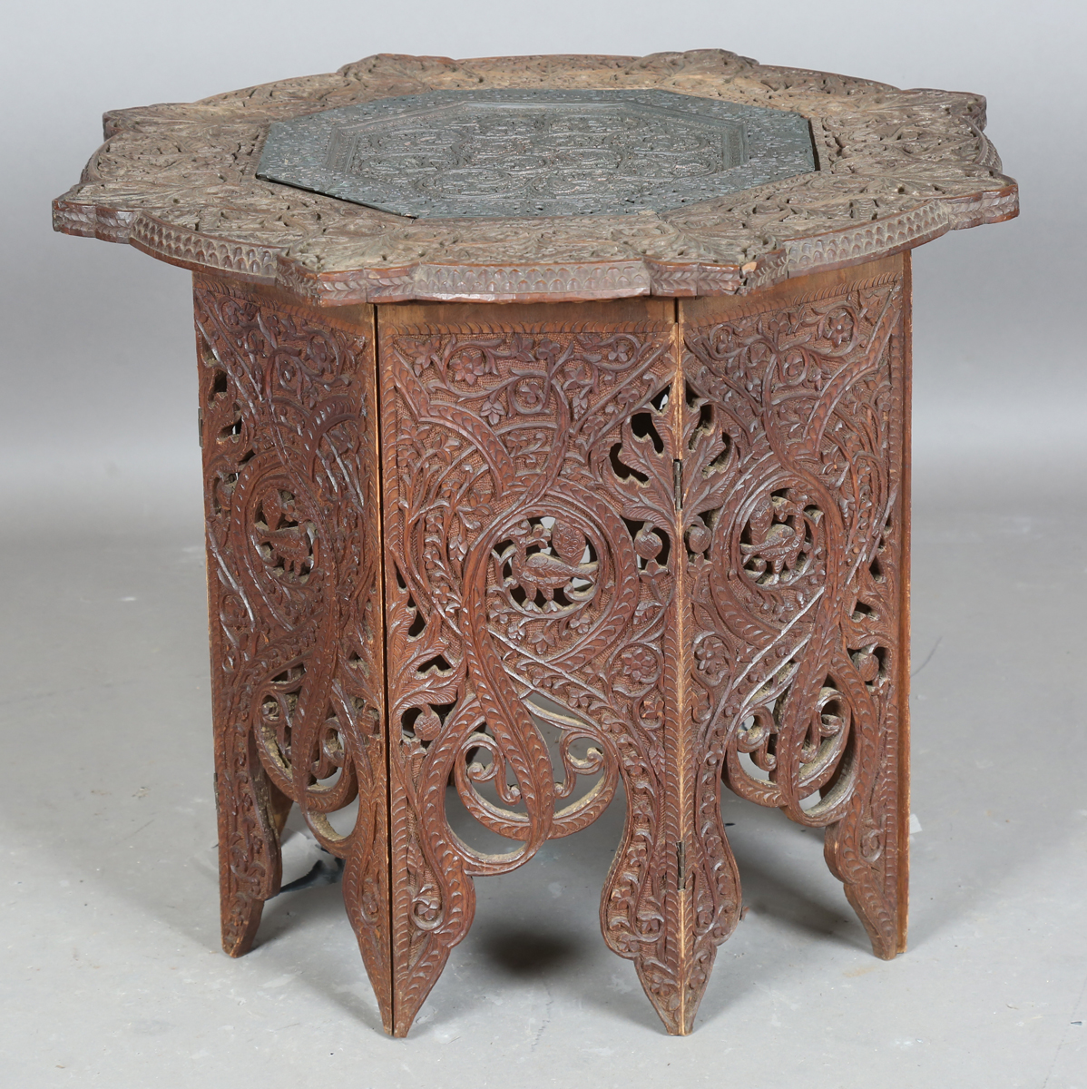 A late 19th century Indian carved hardwood octagonal occasional table, the top inset with a chased copper panel, height 54cm, width 61cm.