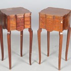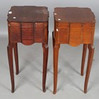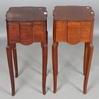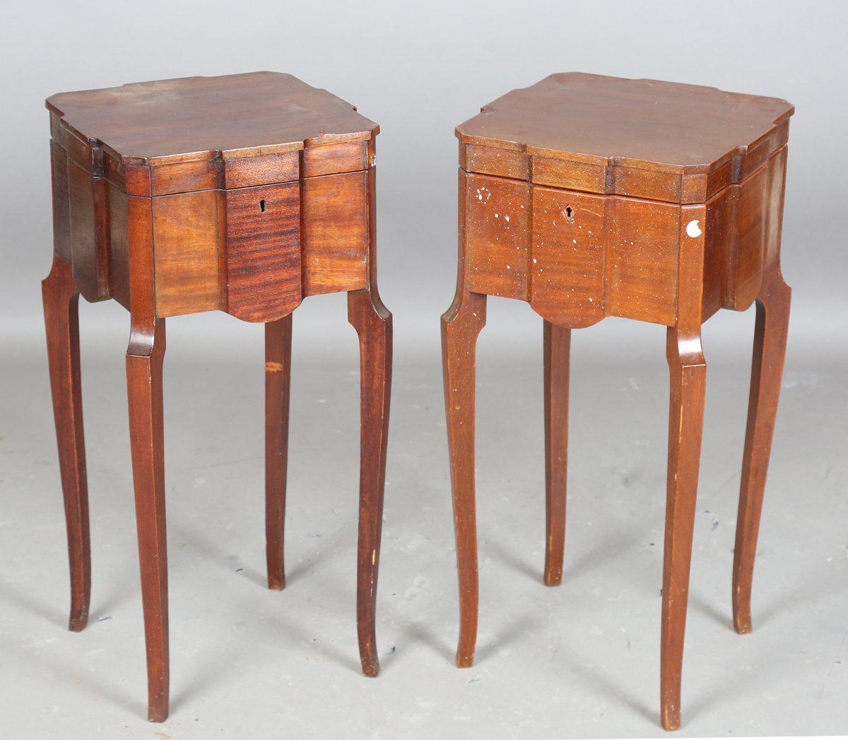 A pair of early 20th century mahogany bedside tables, each fitted with a hinged lid, raised on shaped legs, height 71cm, width 34cm, depth 34cm.