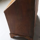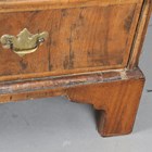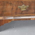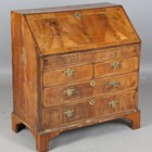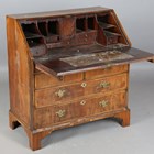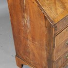 A George I walnut bureau with feather banded borders, the fall flap above an arrangement of oak-lined drawers, height 100cm, width 93cm, depth 52cm (restoration).