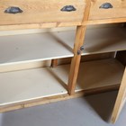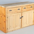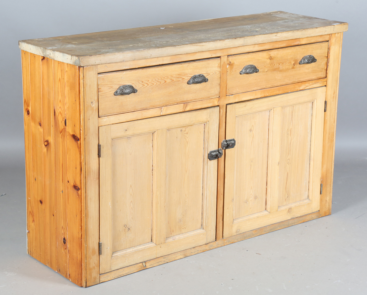 A Victorian pine dresser base, fitted with two drawers and two doors, height 92cm, width 142cm, depth 45cm.