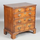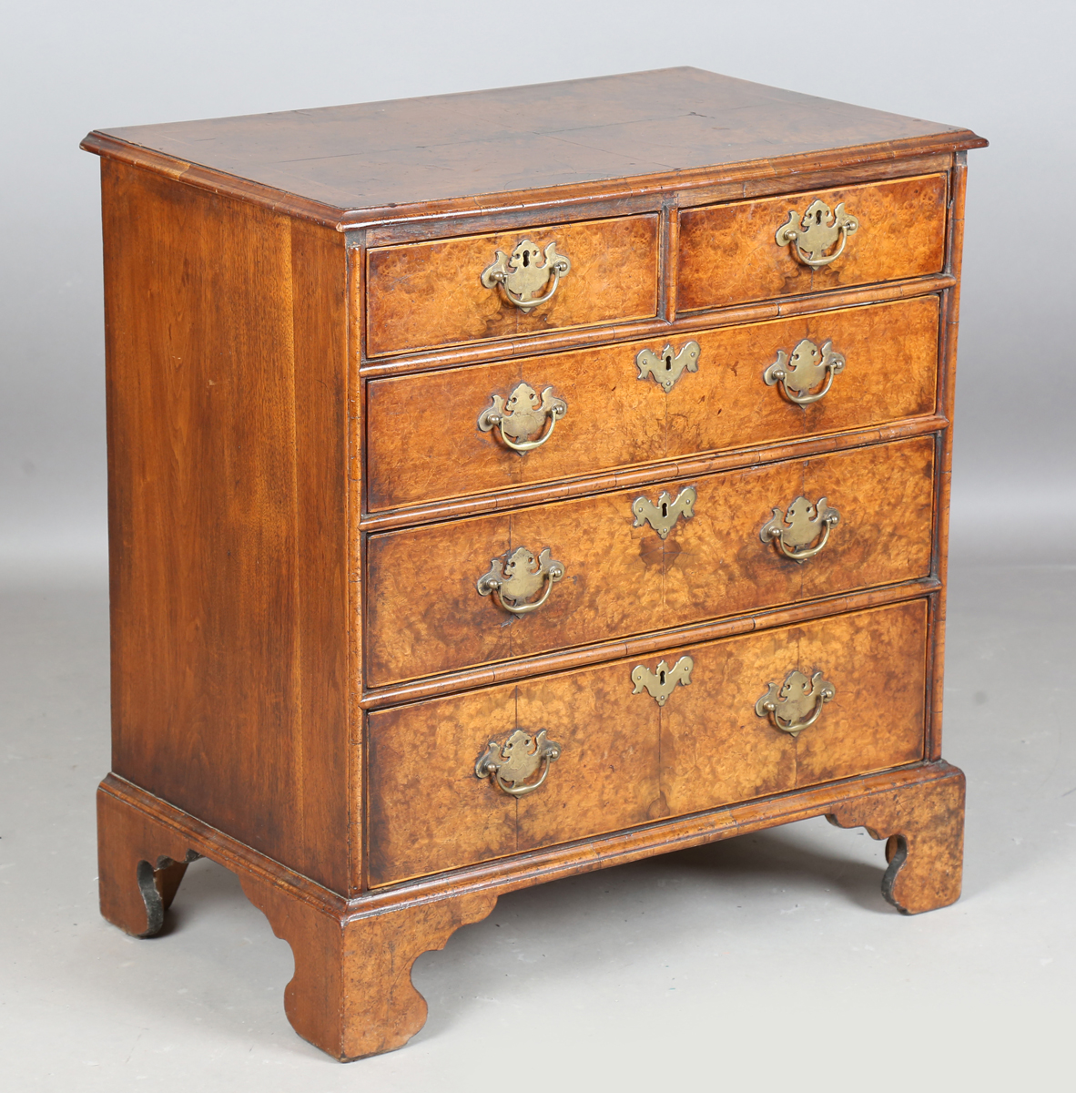 An early 20th century George I style burr walnut chest of two short and three long drawers, height 82cm, width 77cm, depth 48cm.