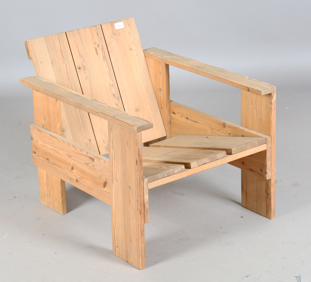 A late 20th century copy of a Gerrit Rietveld crate chair, typically formed from pine planks, height 59cm, width 57cm, depth 71cm.