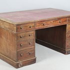 A late Victorian mahogany twin-pedestal partners desk, the top inset with gilt-tooled red leather above an arrangement of twelve drawers and two cupboards, height 76cm, width 152cm, depth 99cm.