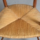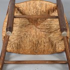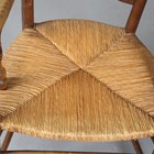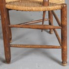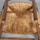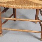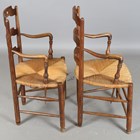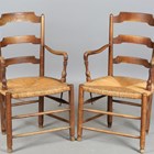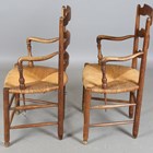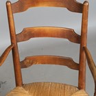 A pair of early 20th century French ash ladder back elbow chairs with rush seats, height 95cm, width 54cm, depth 49cm.
