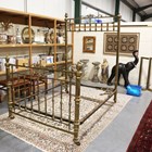 A mid-Victorian brass framed double tester bed with square section supports and scroll mounts, height 231cm, length 154cm, width 217cm.