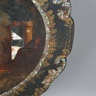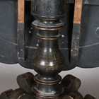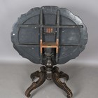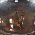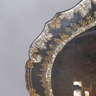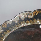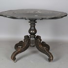 A mid-19th century French papier-mâché and ebonized wooden oval centre table, the shaped top painted and inlaid in mother-of-pearl with a townscape, raised on four downswept legs, height 76cm, width 110cm, depth 87cm (faults and repairs).