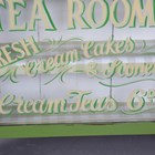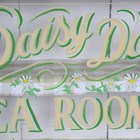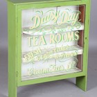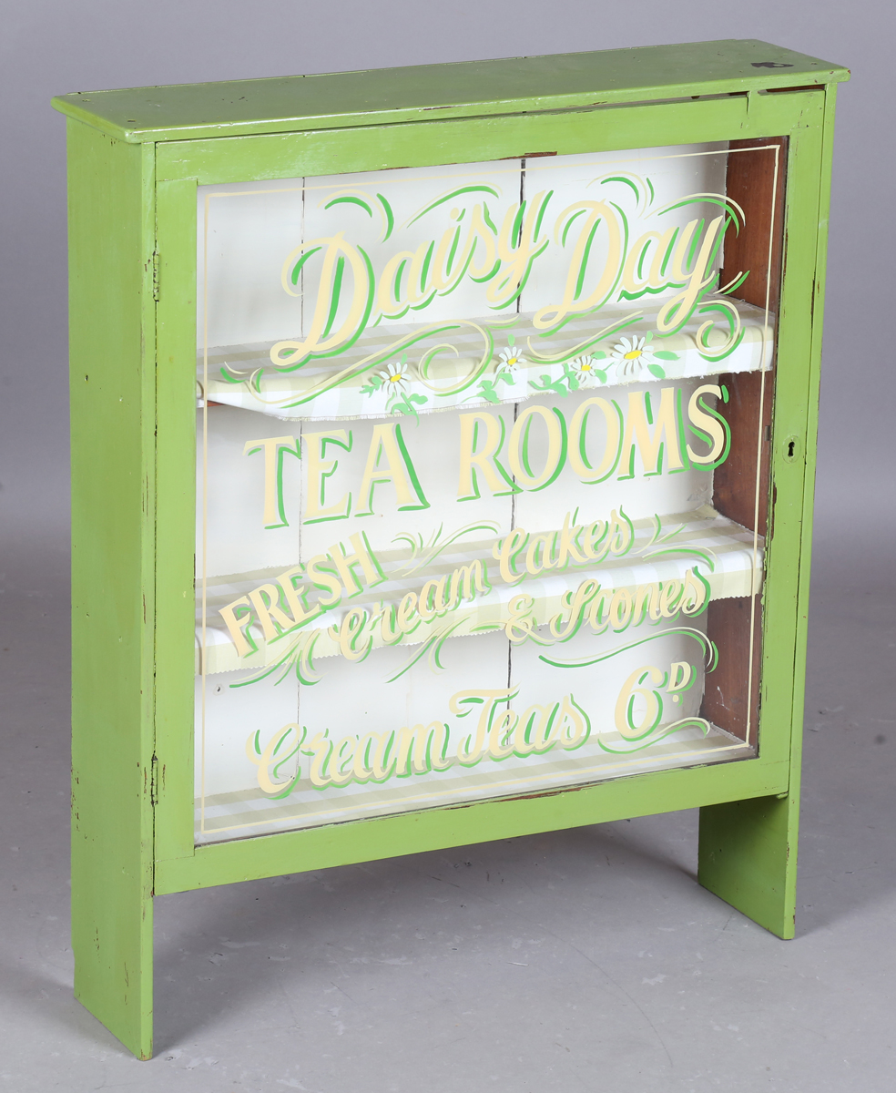 An early/mid-20th century green painted advertising shop cabinet, the glazed door inscribed 'Daisy Day Tea Rooms', height 85cm, width 72cm, depth 17cm.