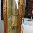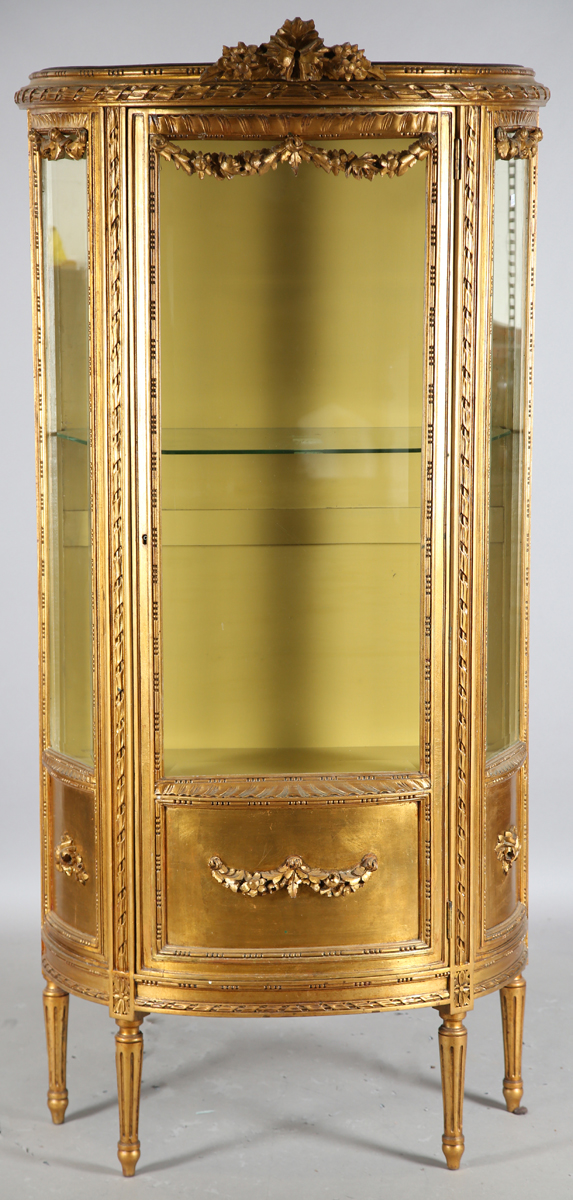 An early 20th century French giltwood vitrine, carved with flower swags and inset with bevelled glass, height 181cm, width 86cm, depth 42cm.