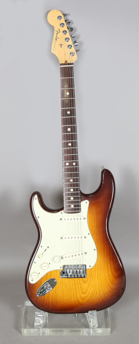 A Fender Stratocaster 50th Anniversary American Deluxe edition left-handed electric guitar, circa 2004, Serial No. DZ4122941, U.S.A. made, within its Fender branded hard case, together with a Blackstar amplifier.