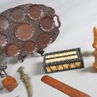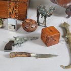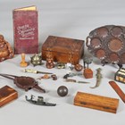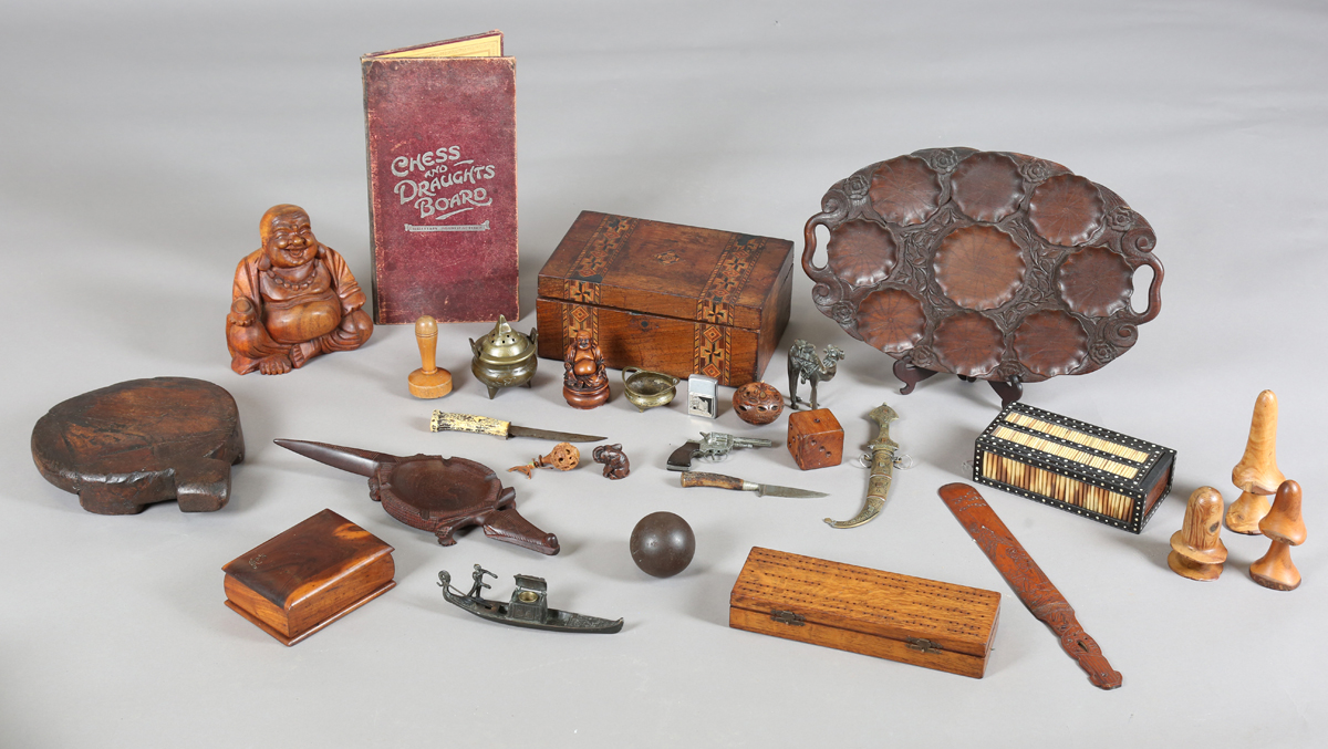 A mixed group of collectors' items, including a porcupine quill inset box, a Victorian walnut workbox and various treen.