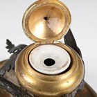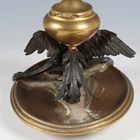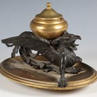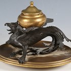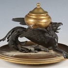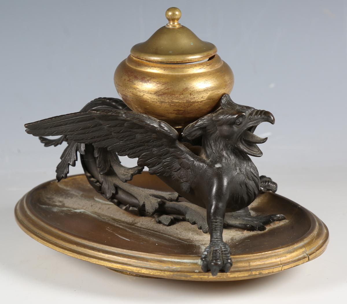 A late 19th/early 20th century bronze and gilt bronze inkwell in the form of a griffin, raised on an oval dish base, length 22cm.