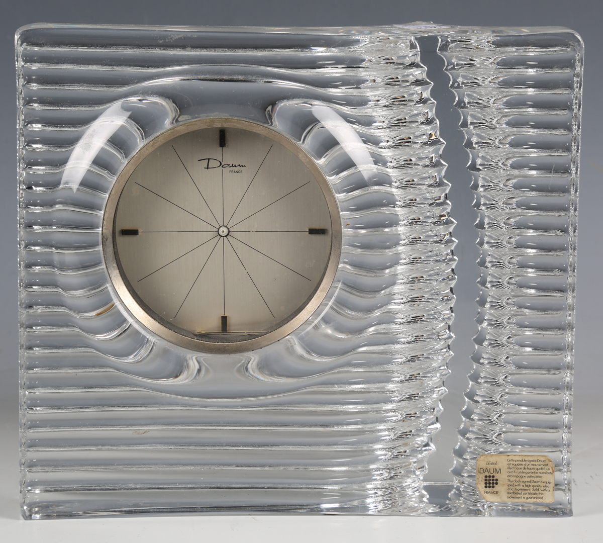 A Daum 'Cristal' glass timepiece with silvered dial and wave shaped case, width 23cm (hands detached).