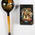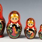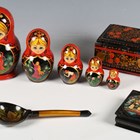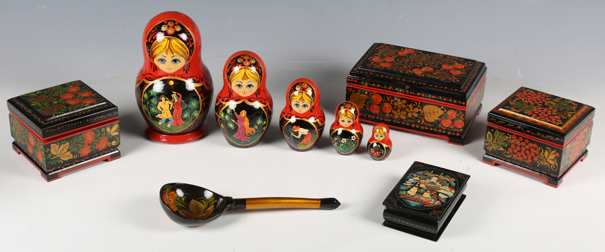 A group of Russian papier-mâché and lacquered wooden items, including a set of interfitting dolls.