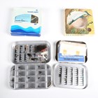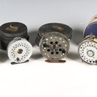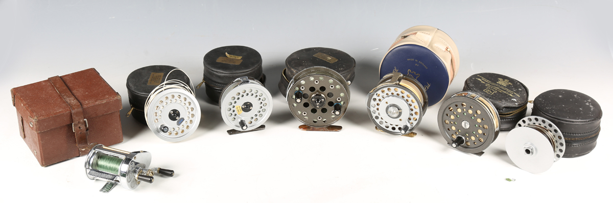 A group of fishing reels and other equipment, including a Hardy Bros 'The Husky', diameter 8.5cm, cased, a Hardy Bros 'The Viscount 130 Mark II', diameter 7.5cm, a Hardy 'Elarex' and various cases of flies.
