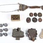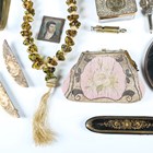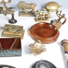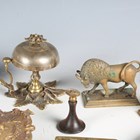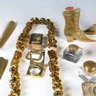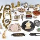A mixed group of collectors' items, including a Victorian brass counter-top bell, an agate and enamelled trinket box, width 9cm, a Victorian papier-mâché spectacles case and various vesta cases and holders.